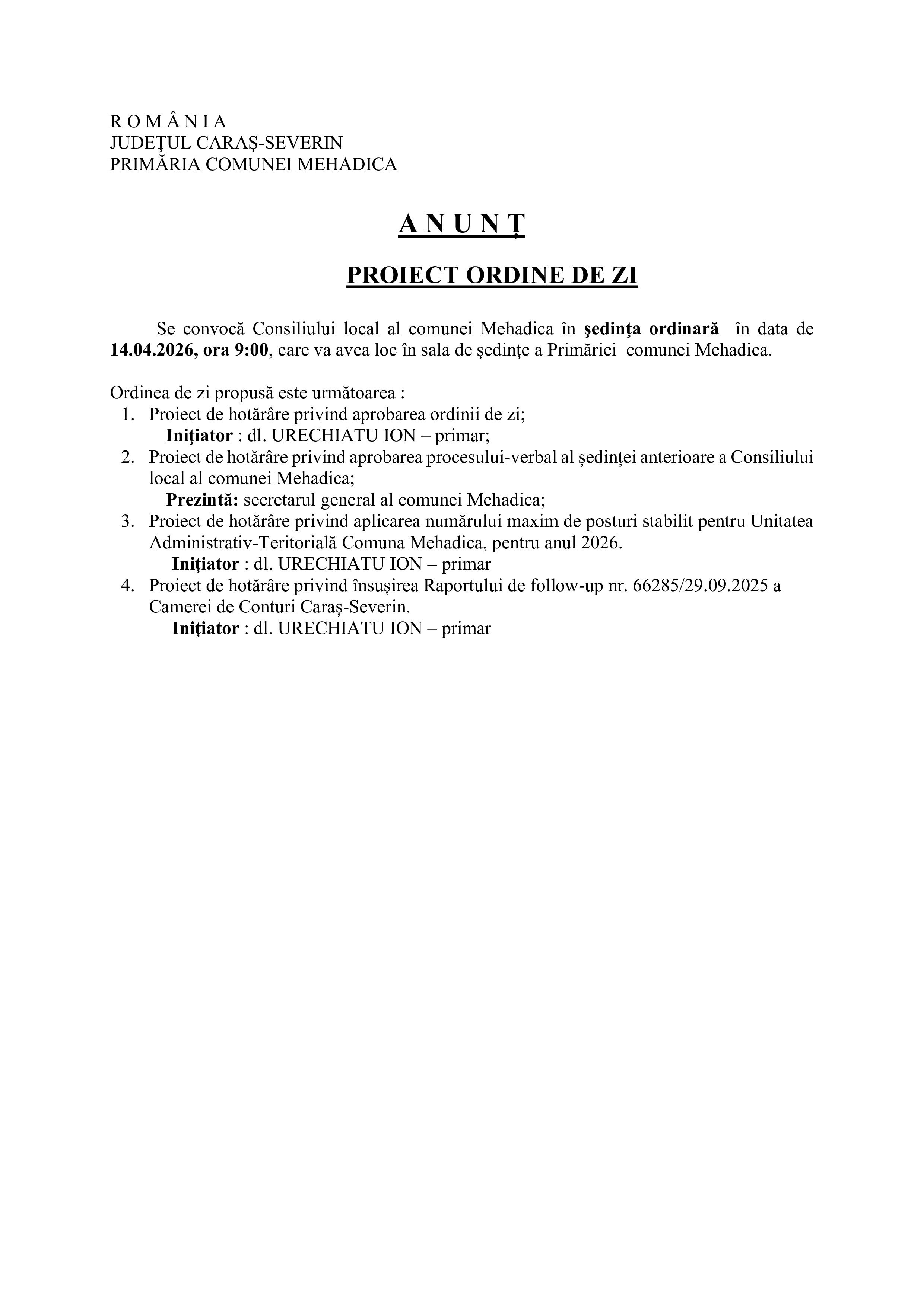 23.04.2024- ANUNT privind examenul de promovare in gradul profesional imediat superior celui detinut , pentru functionarii publici din cadrul aparatului de specialitate al Primarului Comunei Mehadica